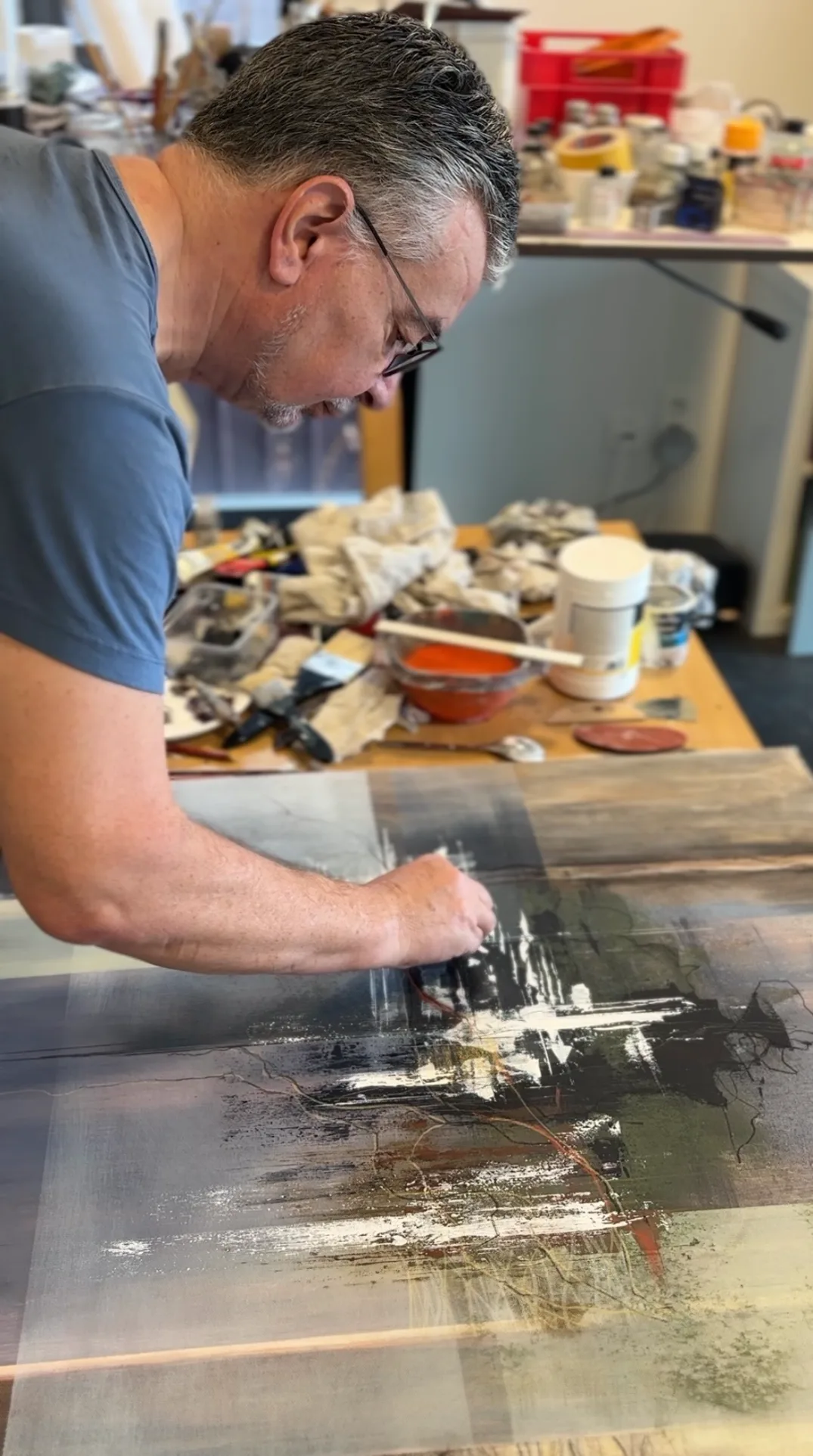 In Erik’s abstract works, the spontaneous layering of textures and colors takes center stage. Layer by layer, the piece develops into its final form. Throughout this process, there is a constant search for harmony and calm within the whole, giving each work its own serene, quiet strength.